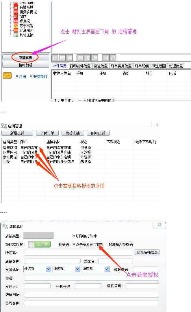 嗯嗯 按照上面三幅圖操作 哪個店鋪使用就登陸哪個店鋪的賬號,千萬不要登陸錯了哦 絕對不要刪除店鋪再新增店鋪,刪除店鋪會刪除數據,要看上面的圖片重新獲取授權 如果是拼多DUO,獲取授權后需要等待10分鐘才能同步訂單 謝謝