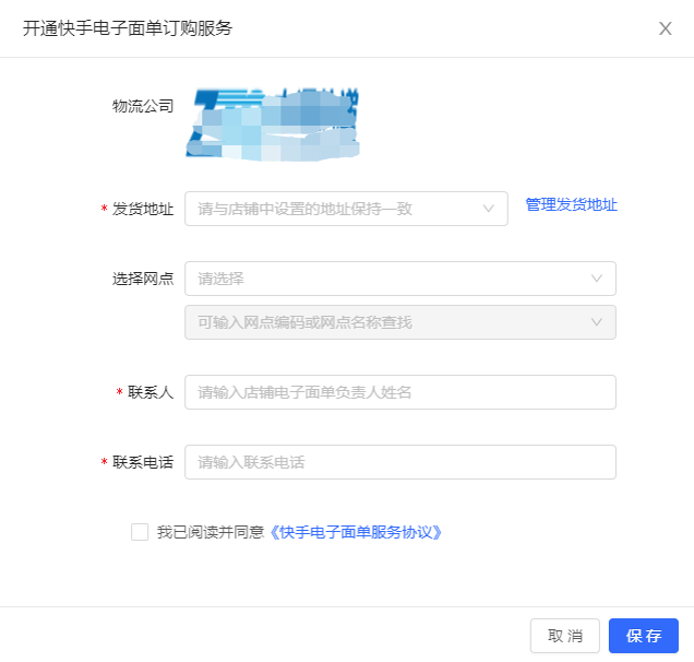 1.登陸快手小店后臺,選擇【物流管理】-【電子面單】-【開通電子面單服務】