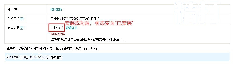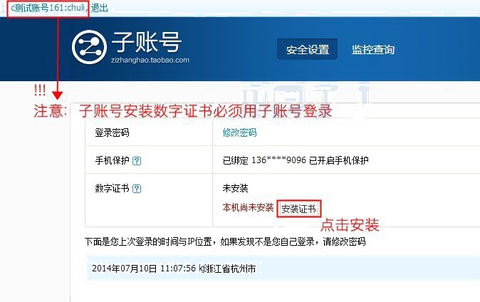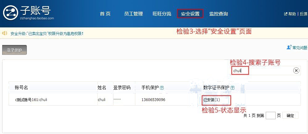 最后,檢驗有沒有安裝成功,可以用主賬號登陸zizhanghao.taobao.com,選擇安全設置,搜索剛剛安裝的員工賬號,會顯示數(shù)字證書保護,已安裝(1)。