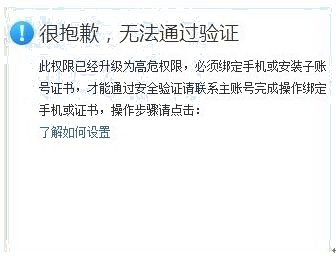 答:出現這個提示,,說明該子賬號的操作涉及高危權限,需要給該子賬號安裝數字證書。