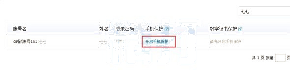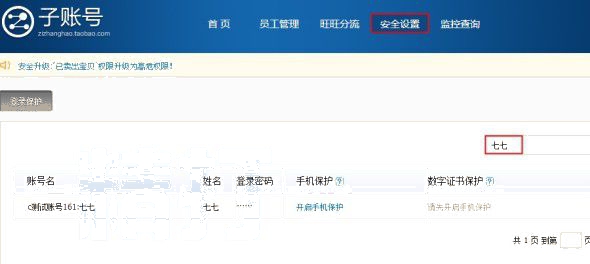 3、在“安全設置”欄搜索需要開通數字證書的子賬號,點擊“開啟手機驗證”(開啟數字證書驗證必須先開通手機驗證)。