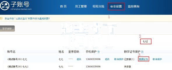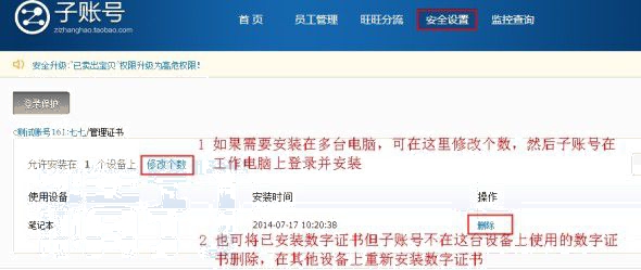 用主賬號登錄子賬號管理后臺(http://zizhanghao.taobao.com/),在安全設置里搜索對應的子賬號,點擊“管理證書”,可修改個數及刪除數字證書。