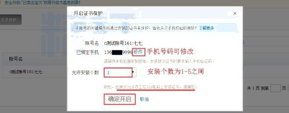 5、再開啟證書保護,選擇的數字N,表示您允許同時有N臺電腦安裝這個子賬號的證書。