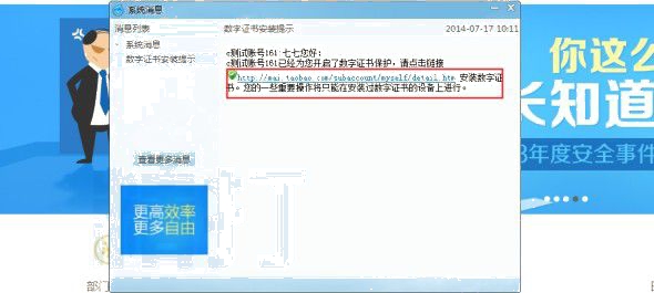 7、登陸后,會收到系統提示,點擊鏈接安裝數字證書。